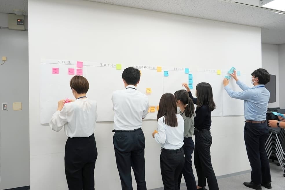 1回目のワークショップでは、情報発信に関する事業を部署ごとに整理。ポストイットに書き出すと、想像以上に情報発信に関わる業務が多いことや、多岐に渡っていることに気づかされました。