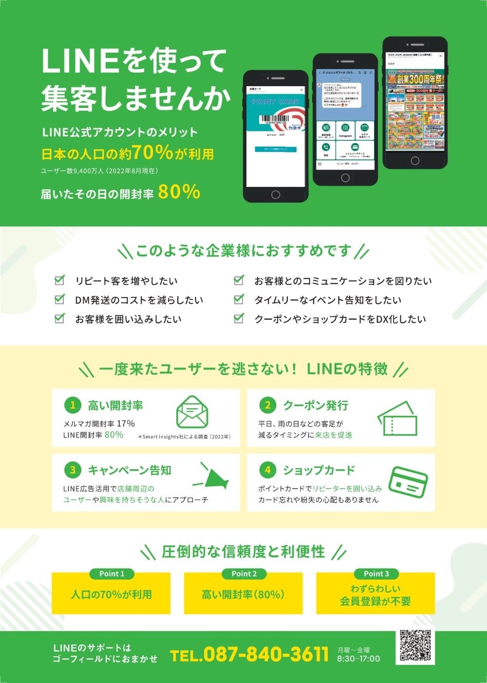 LINEを使って集客しませんか[GOFIELDサービス案内チラシ] Chapter LINE公式アカウントを通じた集客支援サービスを紹介するチラシを制作しました。 GOFIELDでは業種や目的に合わせたオリジナルデザインのチラシをご提案しています。お気軽にご相談ください。 #印刷物 facebook X(旧Twitter) line