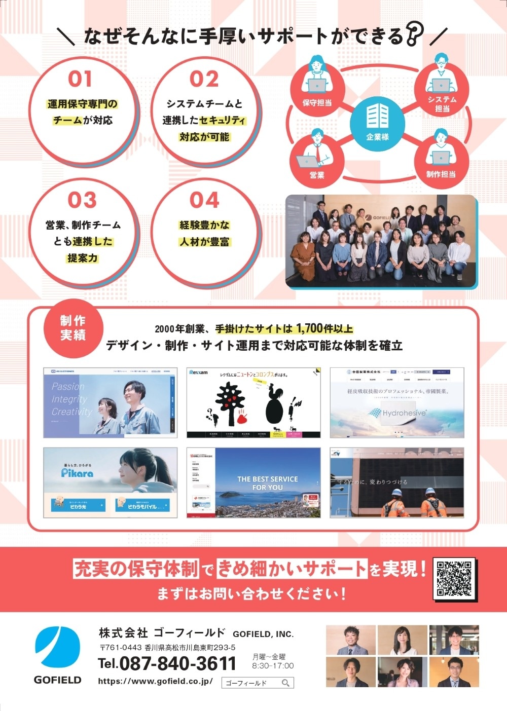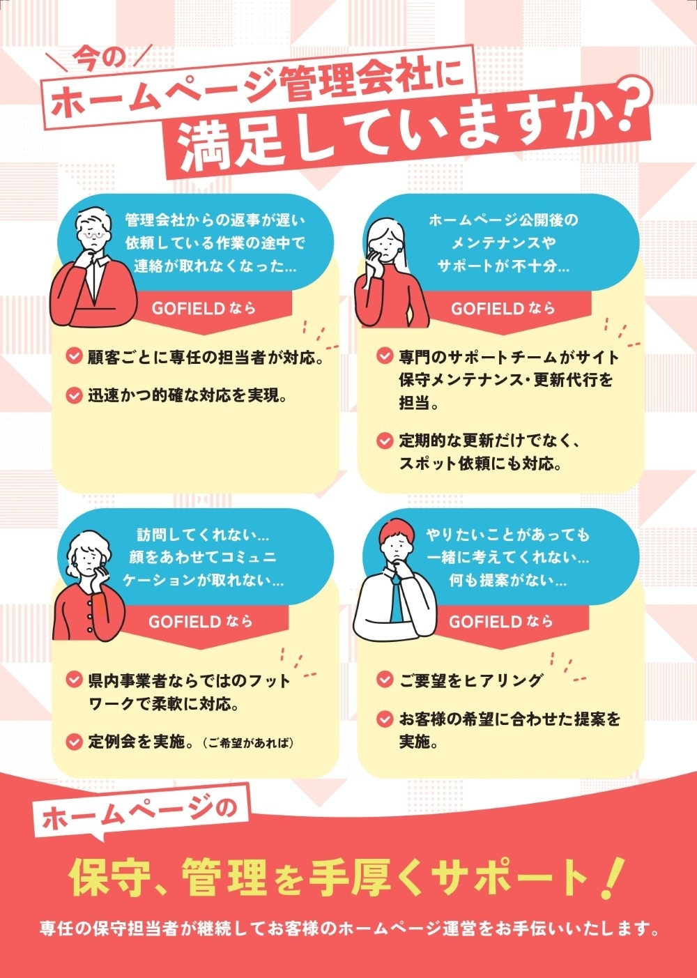 今のホームページ管理会社に満足していますか?[GOFIELDサービス案内チラシ] Chapter ホームページの運用支援サービスを紹介するチラシを制作しました。 GOFIELDでは業種や目的に合わせたオリジナルデザインのチラシをご提案しています。お気軽にご相談ください。 #印刷物 facebook X(旧Twitter) line